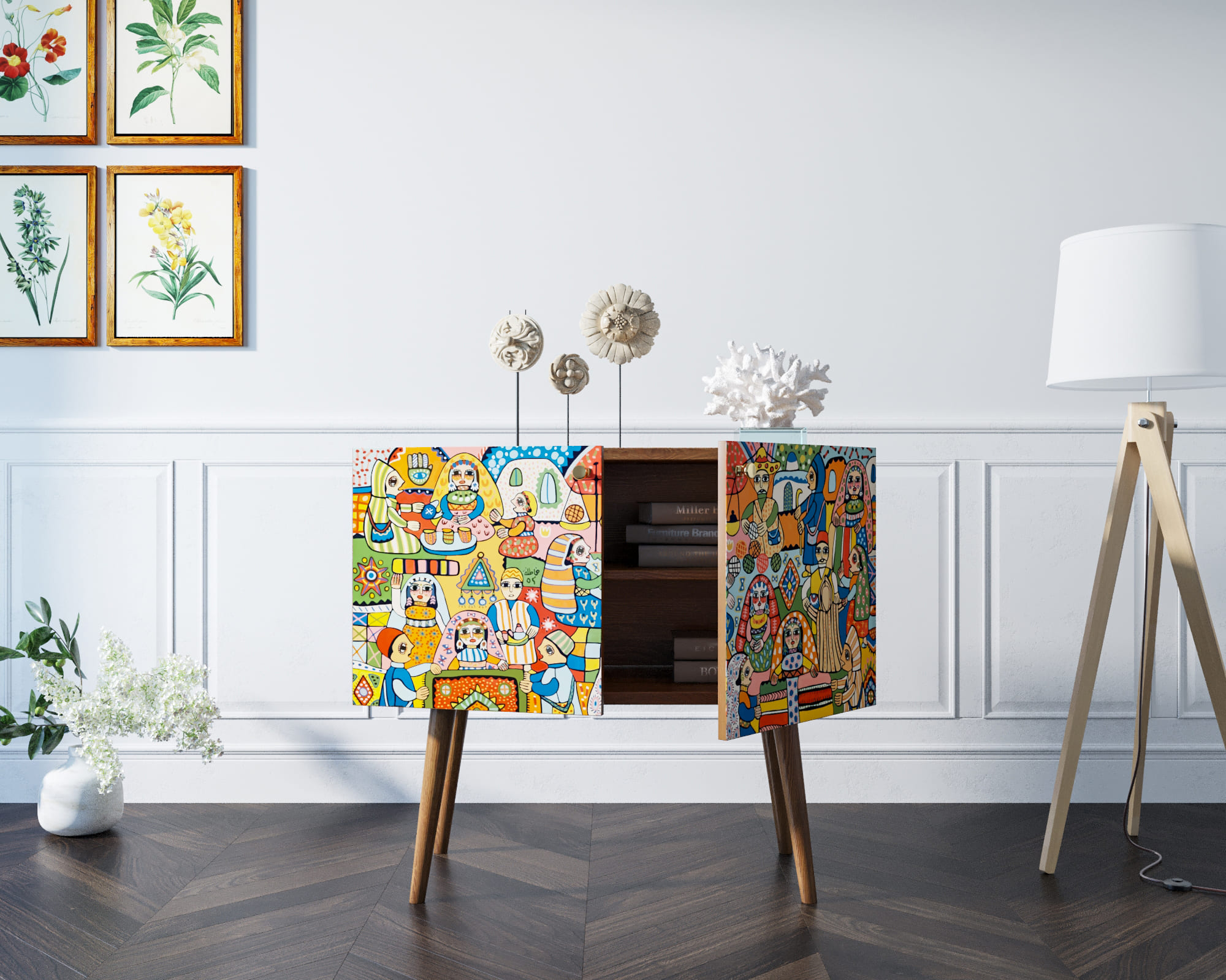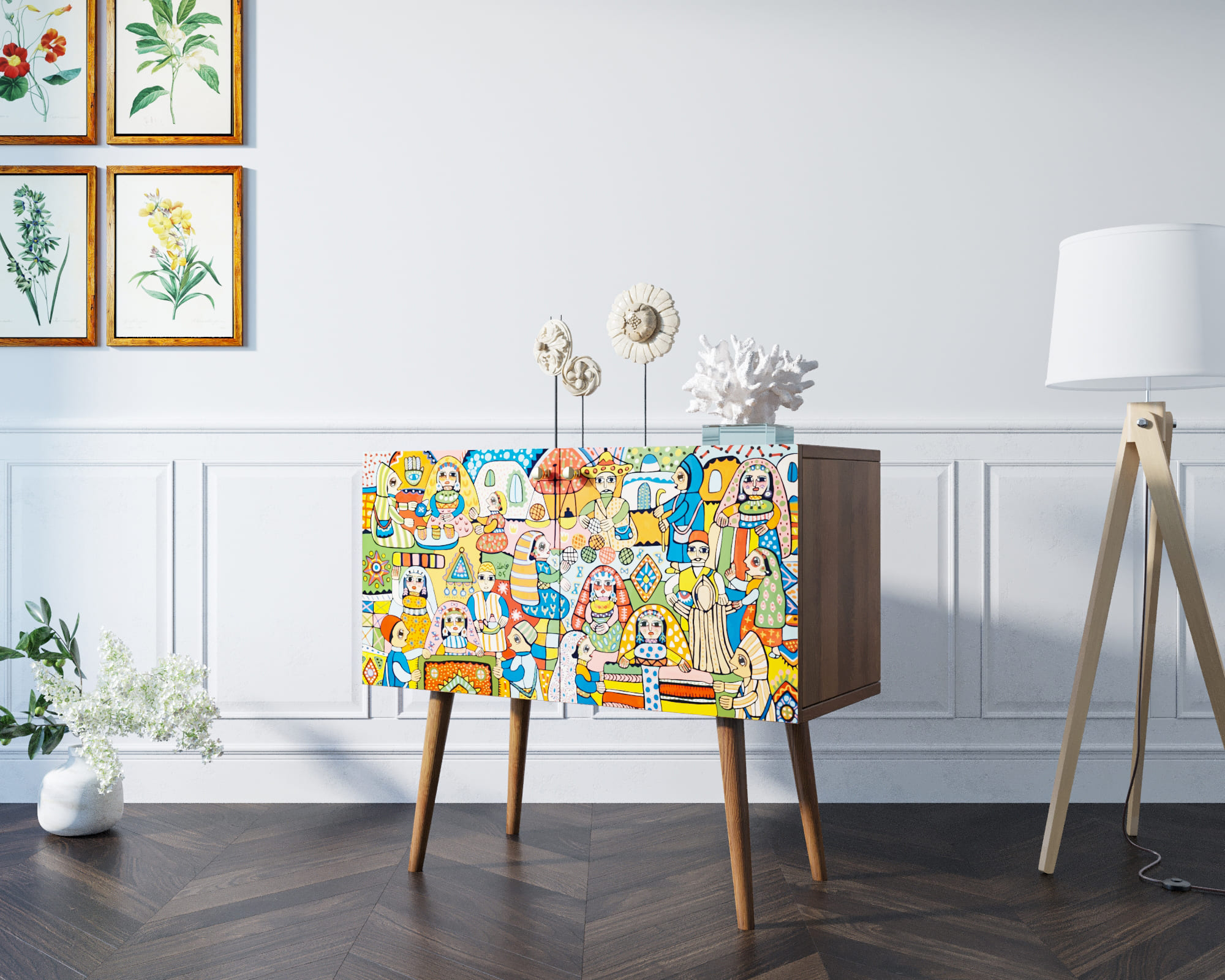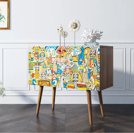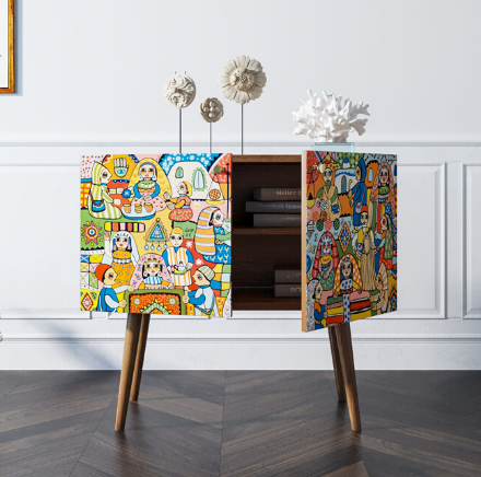 Корпус мебели может быть выполнен в двух вариантах: белый или под дерево.Корпус и ящики изготавливаются из ЛДСП австрийской компании "EGGER". Ножки мы делаем из массива ясеня и крепим на стальную пластину, на дверях петли с доводчиком а на ящиках шариковые направляющие. Принт на фасады наносится принтером специальными УФ - чернилами.