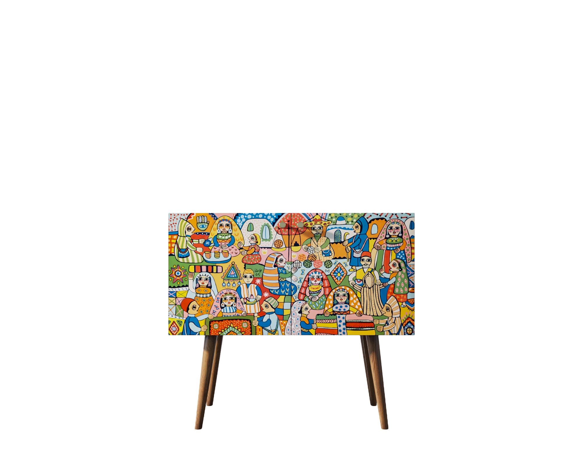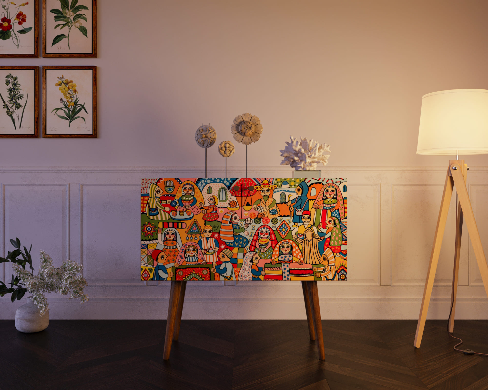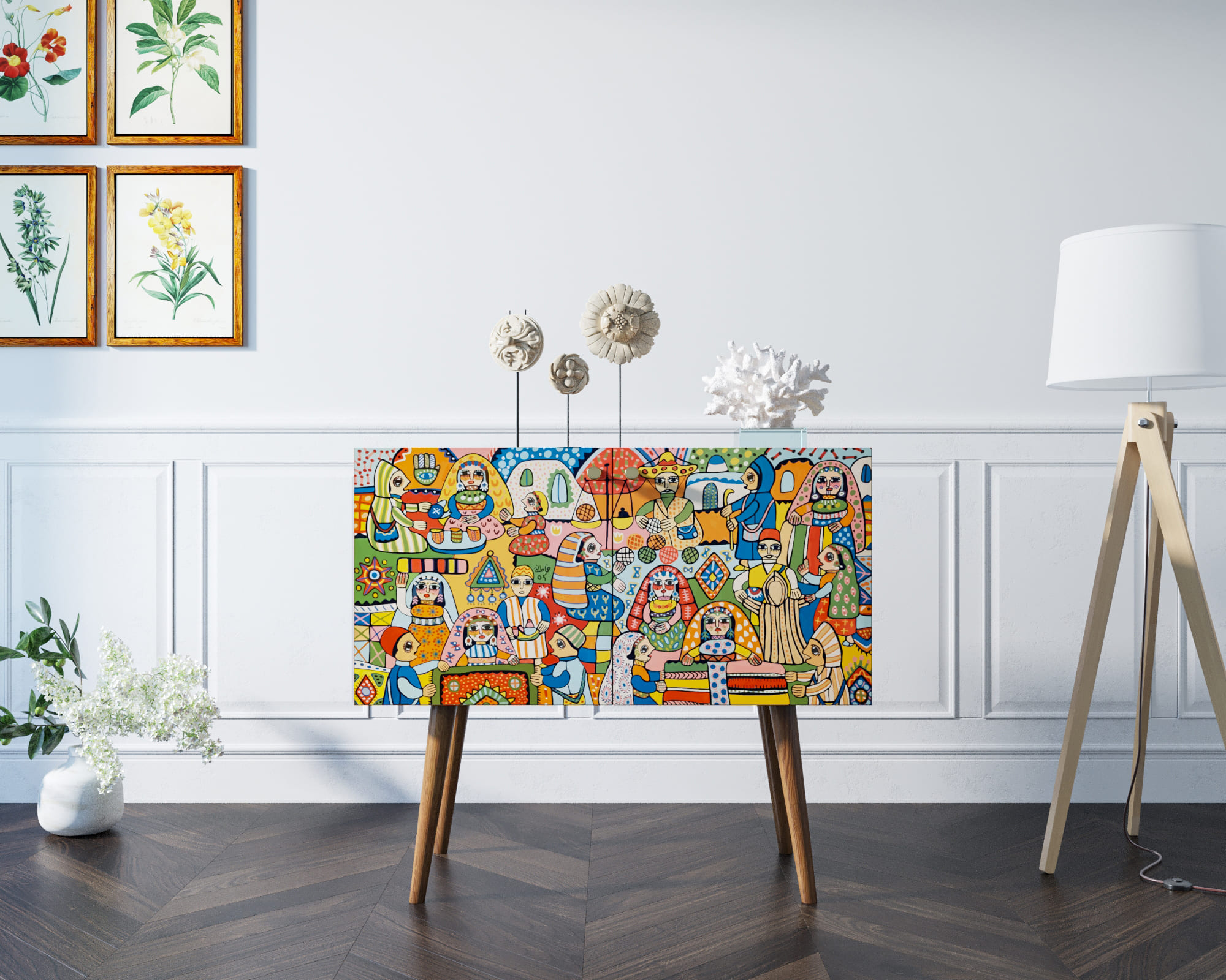 Корпус мебели может быть выполнен в двух вариантах: белый или под дерево.Корпус и ящики изготавливаются из ЛДСП австрийской компании "EGGER". Ножки мы делаем из массива ясеня и крепим на стальную пластину, на дверях петли с доводчиком а на ящиках шариковые направляющие. Принт на фасады наносится принтером специальными УФ - чернилами.