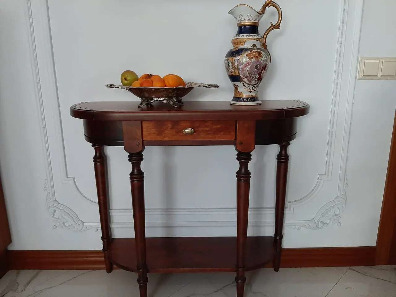 У консоли есть небольшой выдвижной ящик и вместительная нижняя полка. На ящике удобная металлическая ручка. Габариты стола 950х320х780 мм, вес 18 кг. Изделие поставляется в собранном виде. Обратите внимание, что этот стол, как и вся мебель «Луи Филипп», делается под заказ. Сроки изготовления уточняйте у наших продавцов в салонах или по телефону на сайте.