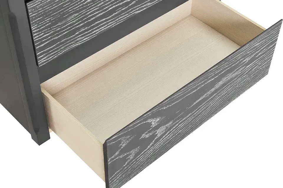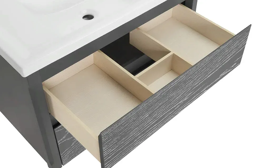 Ящики тумбы выдвигаются на всю ширину и рассчитаны на нагрузку до 40 кг. В верхнем ящике сделаны удобные отсеки для раскладывания вещей, а пенал оснащен полками, которые можно вынуть при уборке. Дверцы и ящики двигаются плавно благодаря качественной европейской фурнитуре.