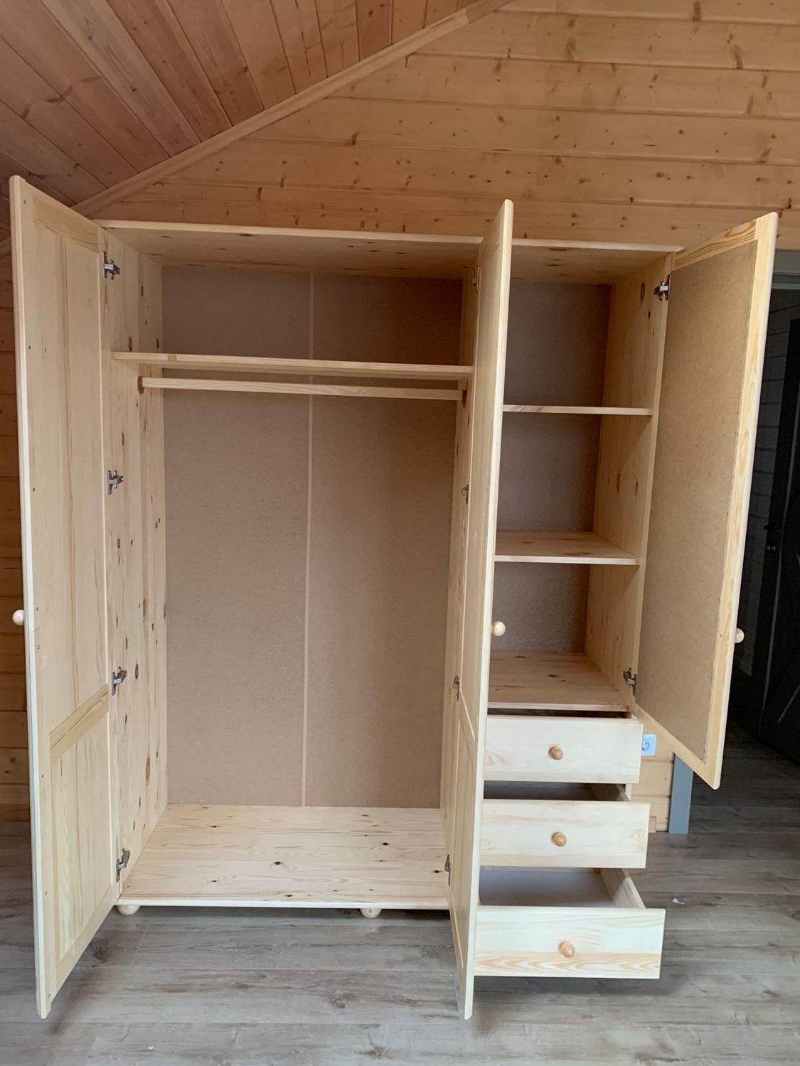 При изготовлении шкафа, кроме натурального дерева, не применяется никакие другие материалы, наподобие дсп, мдф и многих других материалов, которые могли бы поставить под сомнение экологичность изделия. Кроме того, сосна также отличается и привлекательным внешним видом. Кому-то может показаться, что сосновая древесина недостаточно прочная и долговечная, однако эта проблема давно осталась в прошлом, поскольку современные технологии обработки дерева позволяют любой материал сделать удивительно износостойким и защитить его практически от любых внешних воздействий, которые могут разрушить необработанное дерево.