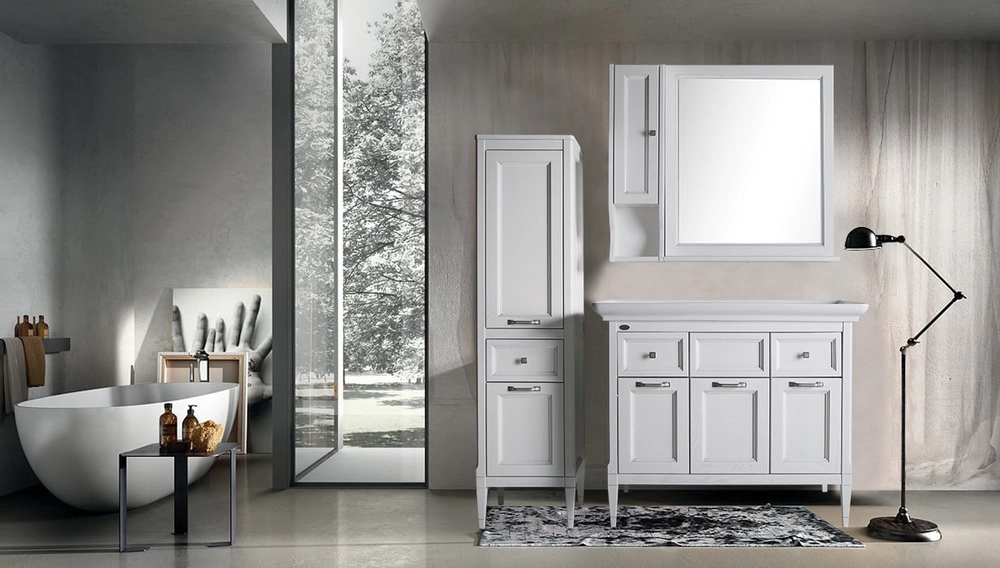 «Гранда» – это дизайнерская коллекция мебели для ванной комнаты в классическом стиле. В коллекцию входят тумба и пенал для напольной установки, керамическая раковина и зеркало со шкафчиком. Каждый предмет можно приобрести отдельно.