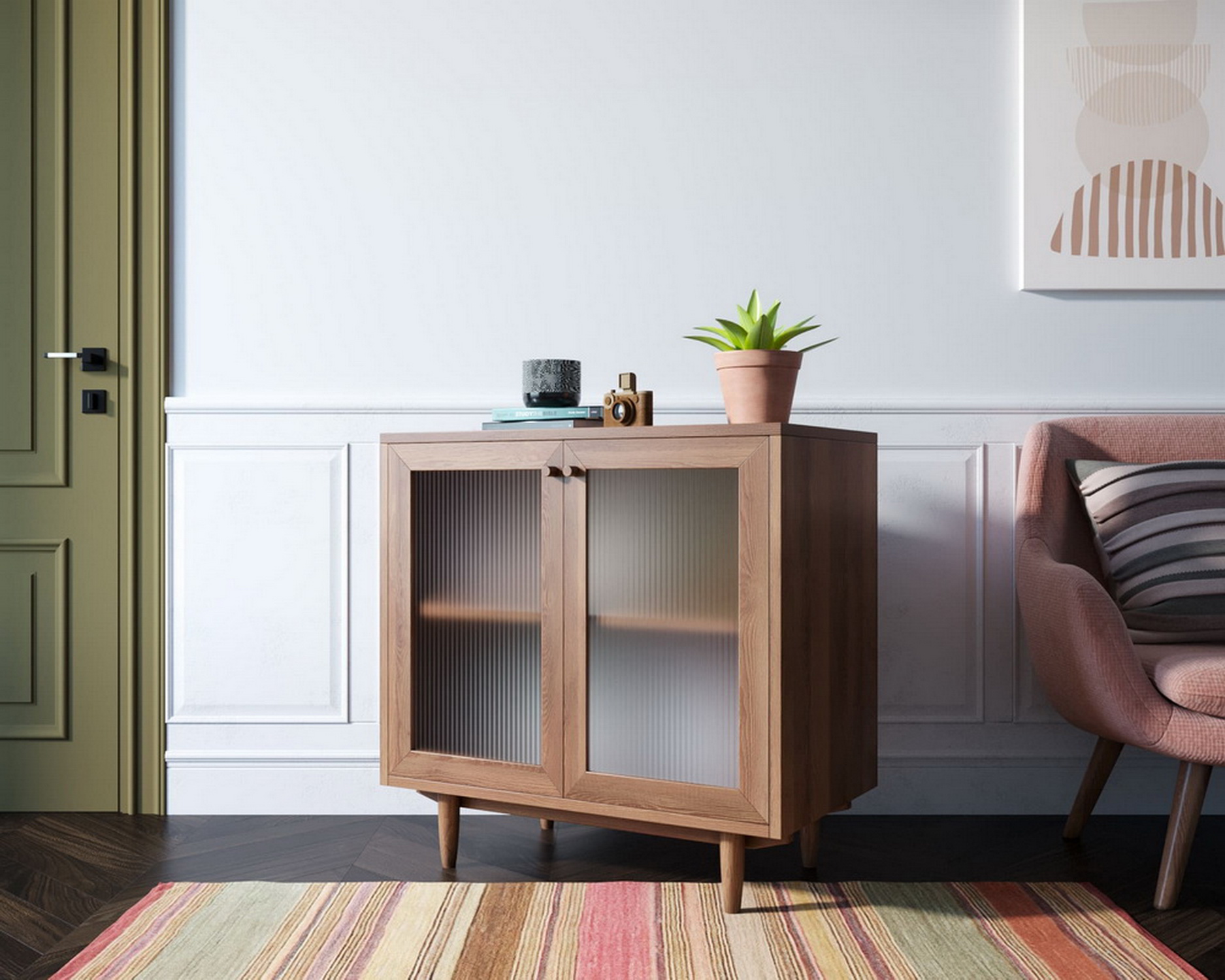 Дверцы тумб и шкафов украшены вставками из матового стекла. Коллекция разработана по модульной системе: комбинируя разные предметы, можно делить пространство на зоны. Производитель может изготовить предмет по размерам заказчика, выполнить окраску по RAL, оснастить дверцы доводчиками.