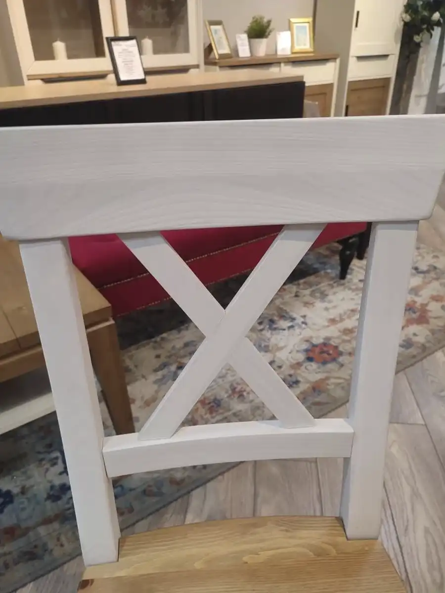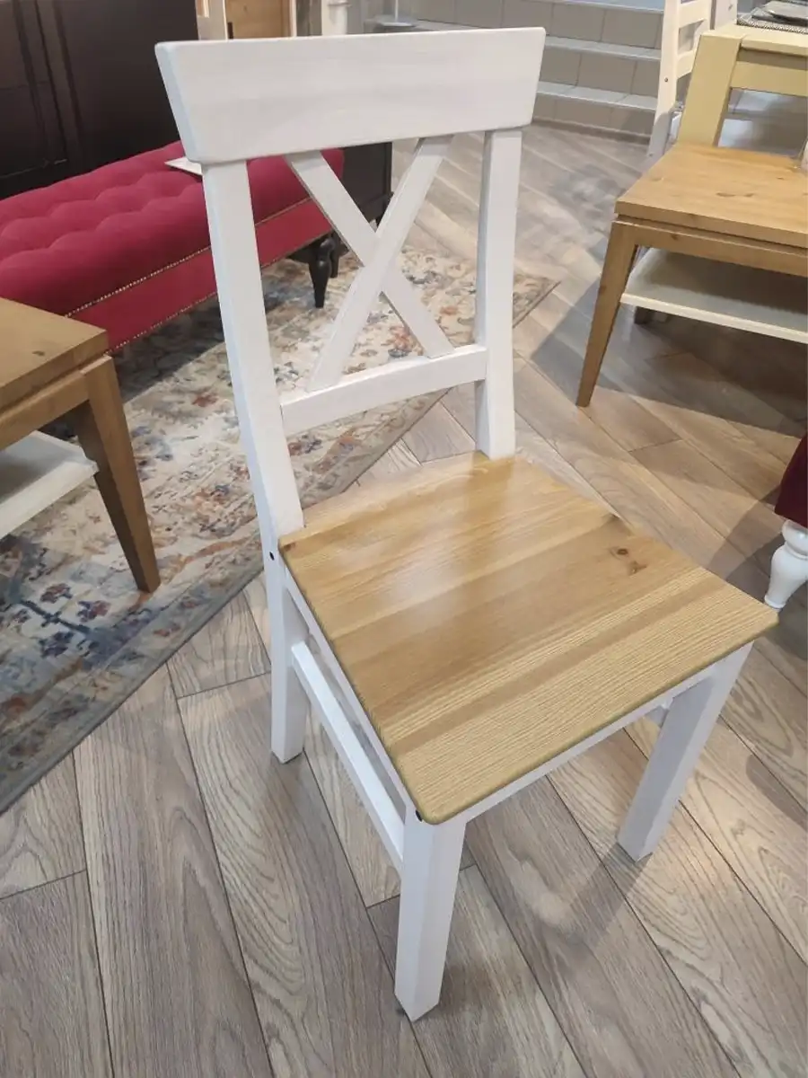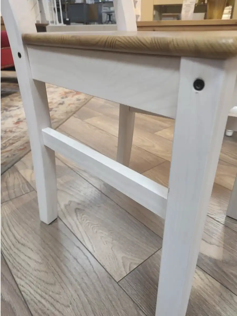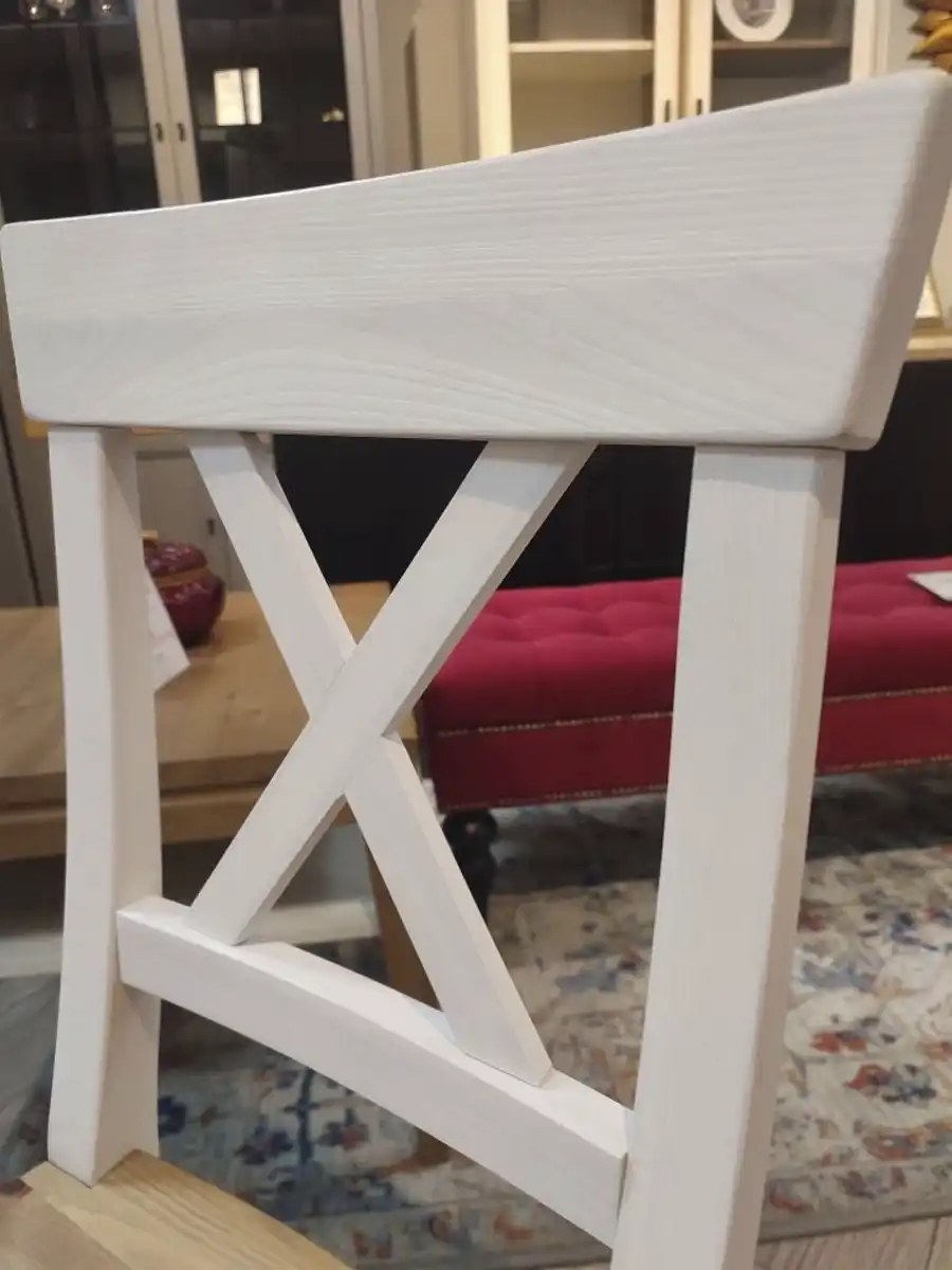 Стул сделан из натурального массива, а потому отличается прочностью и долговечностью. Высота сиденья 45 см. Покрытие стула - укрывистый белый лак в комбинации с цветом антик. На поверхности просвечивает природный рисунок, благодаря чему каждое изделие выглядит по-настоящему уникальным.