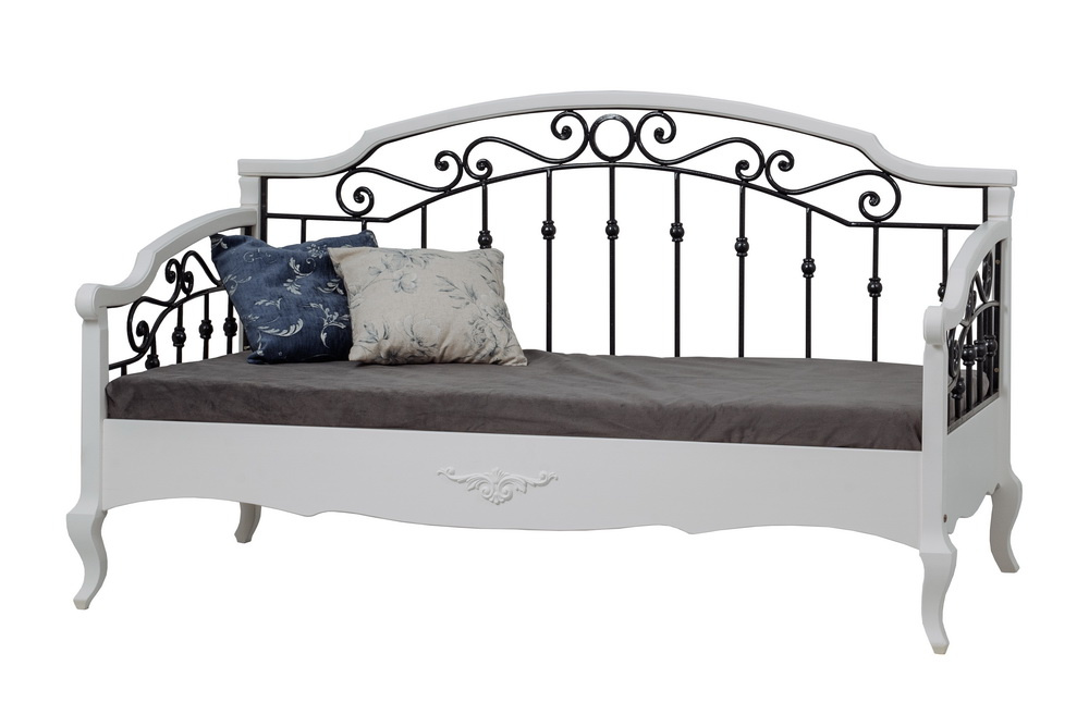 Выбираете стильную и удобную тахту из натурального дерева? Тогда обратите внимание на тахту с кованой спинкой «Ари-Прованс №15» 800х1600 из массива сосны. Она станет прекрасным дополнением к интерьеру спальни или гостиной. Можно выбрать цвет отделки корпуса и цвет металла для спинки: черный молотковый, коричневый молотковый, коричневый матовый, черный матовый, серый матовый. Высота задней спинки тахты – 1030 мм, боковин – 785 мм. Высота ножек – 180 мм. Царга украшается декоративным элементом из полиуретана (кроме изделий в бесцветном лаке).