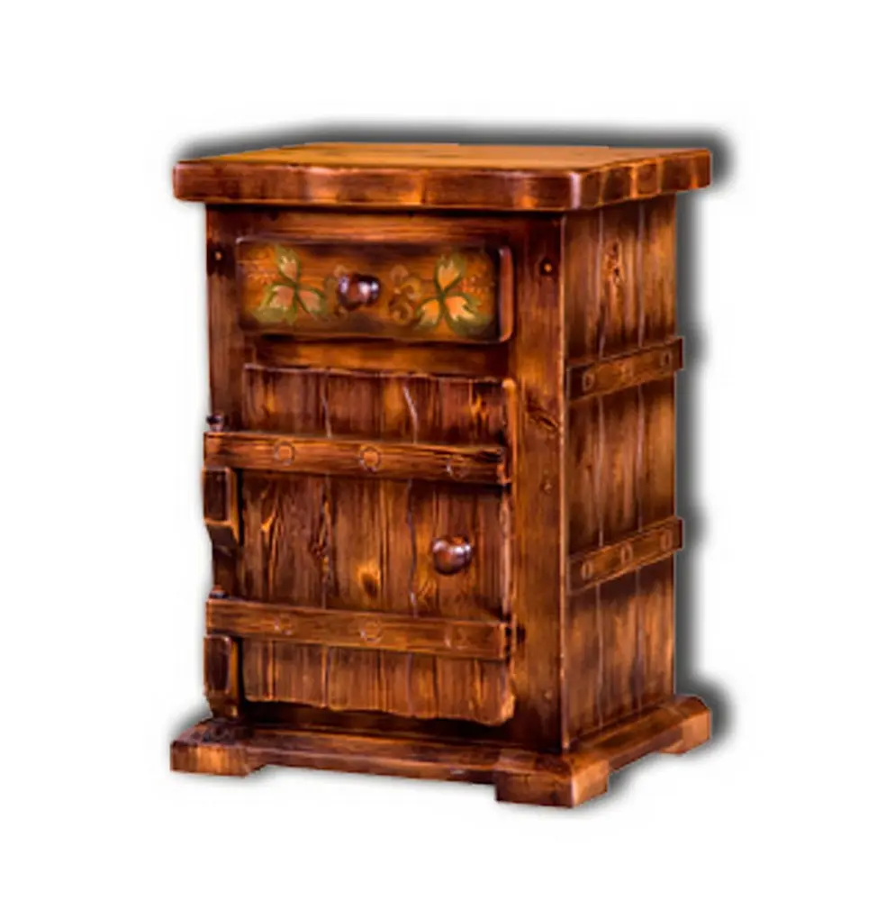 Такая тумбочка отличается оригинальным стилем исполнения. Изделие производится из износоустойчивого массива сосны с тонировкой и брашированием. На фасаде вы обнаружите великолепную роспись. Конструкция состоит выдвижного ящика и секции, скрытой за глухим фасадом двери. Образец установлен на довольно устойчивое основание. В комплектацию включена фурнитура европейского качества. В плане ухода эта мебель менее требовательна: вы можете протирать поверхность мягкой тканью с использованием небольшого количества воды.